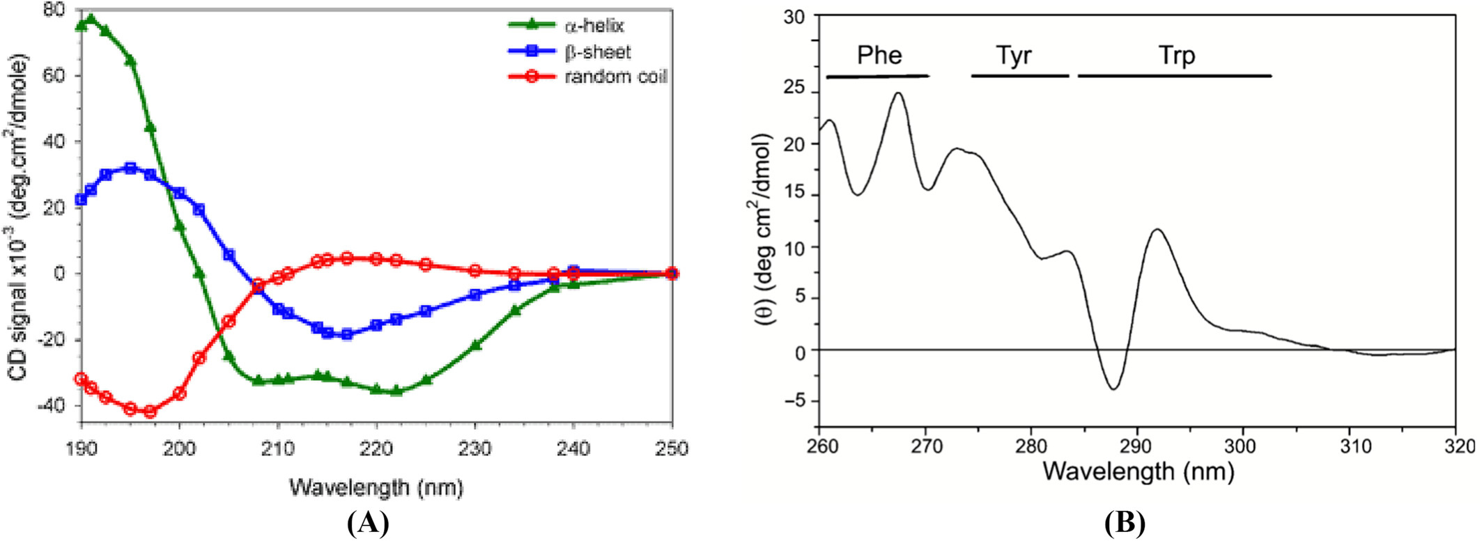 255至270 nm的信号归属于苯丙氨酸残基的苯基,275至285 nm的信号归属于酪氨酸的酚基,285至305 nm的信号归属于色氨酸的吲哚基。(见上图B)